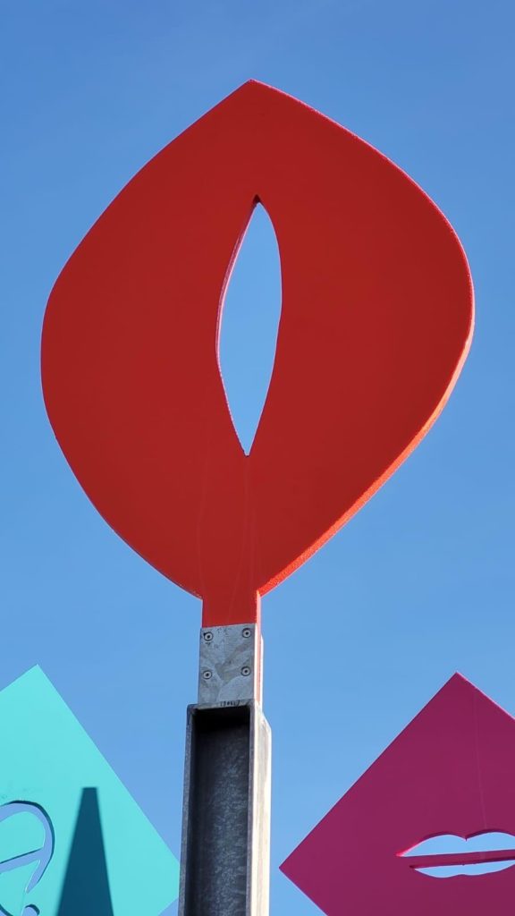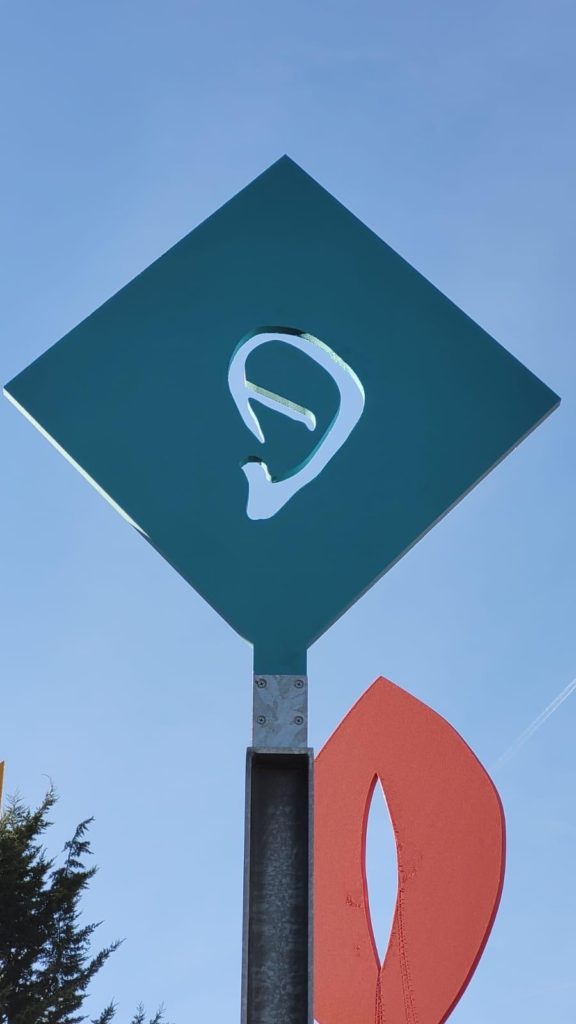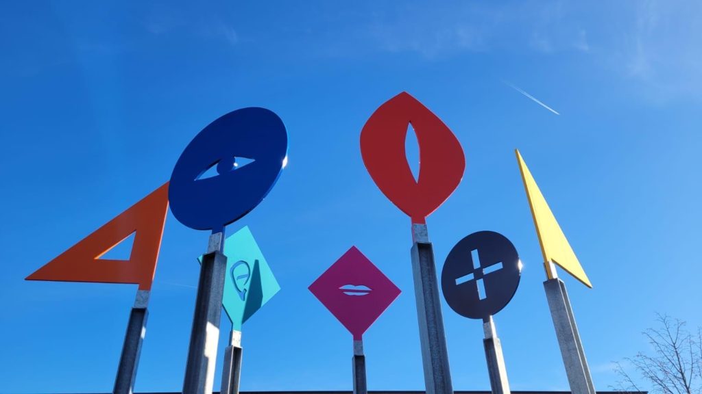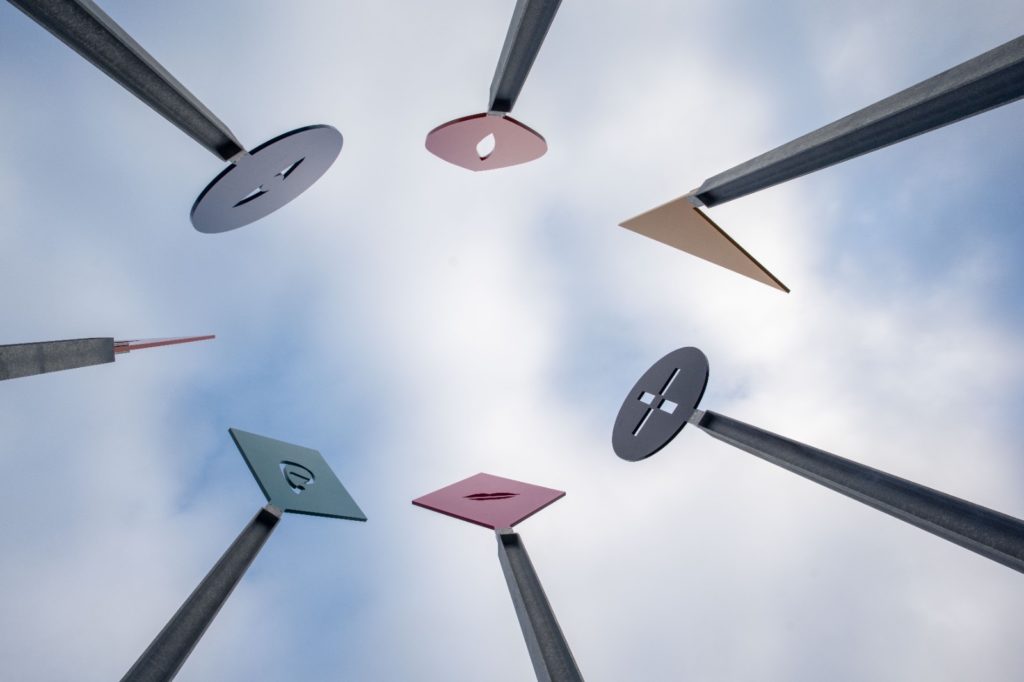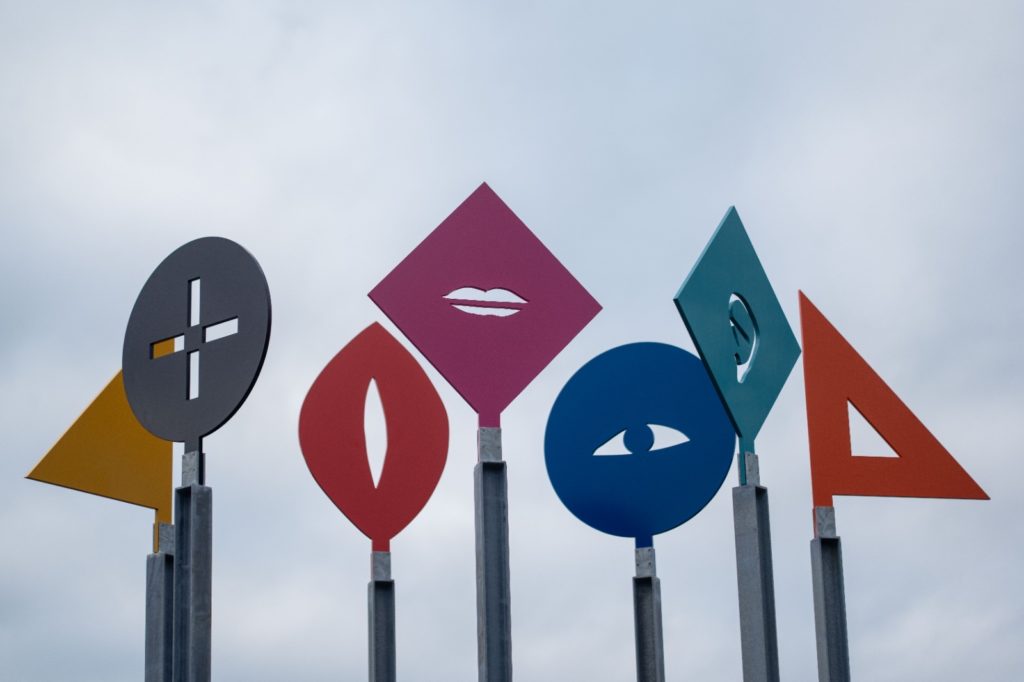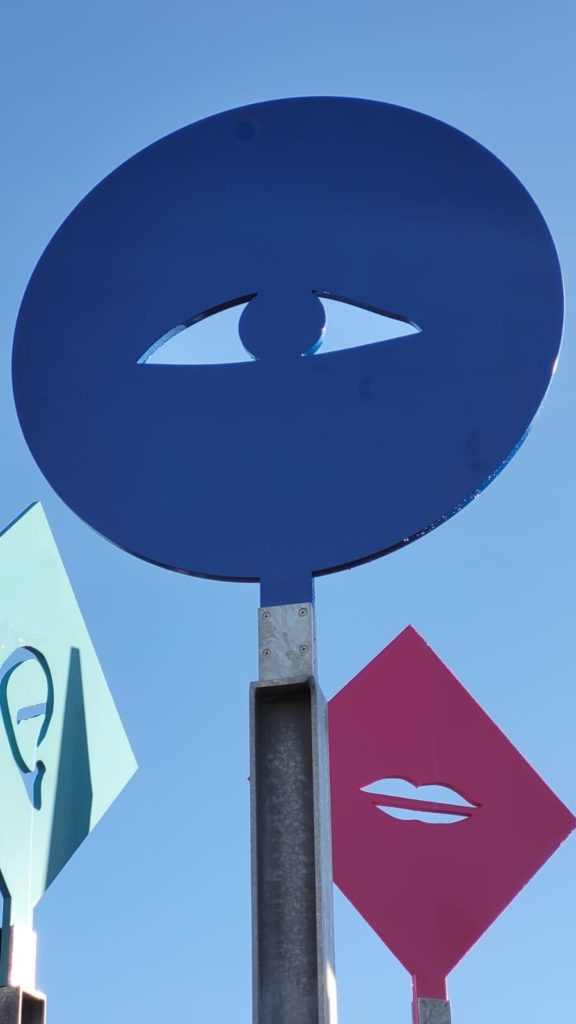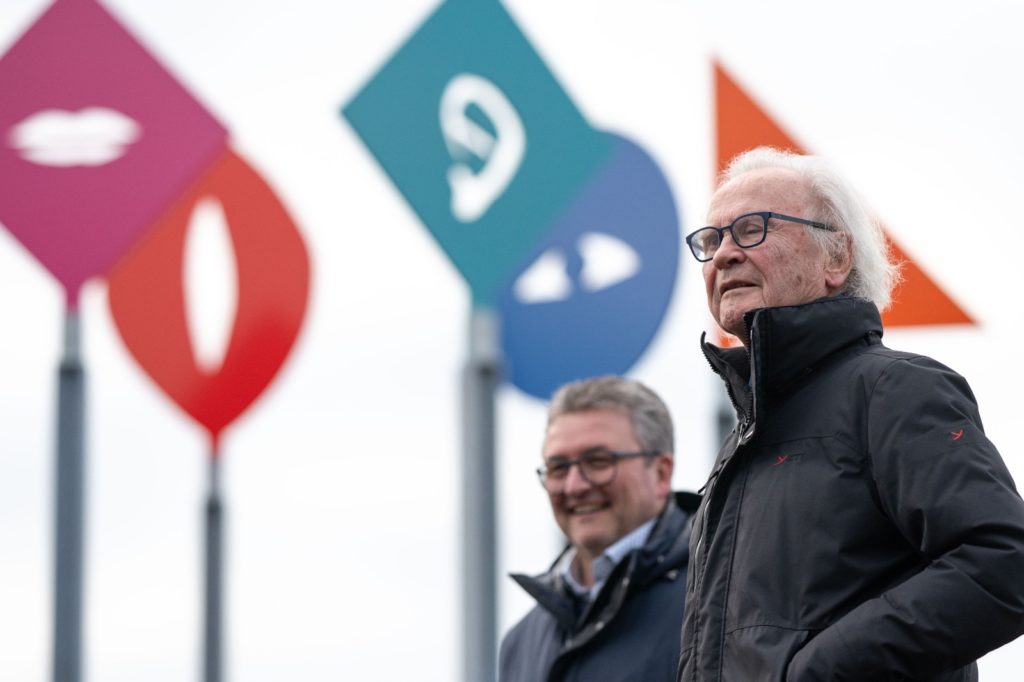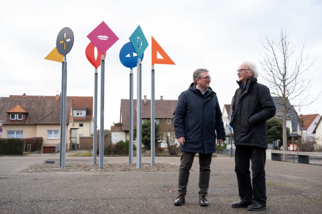Nun wurde eine weitere Skulptur enthüllt: Anlässlich des 90sten Geburtstags hat die Stadt Mössingen ein Werk für den öffentlichen Raum in Auftrag gegeben, das am 13.12.2025 vor der Friedrich-List-Gemeinschaftsschule in Mössingen präsentiert wurde. Die Verkehrsschildern ähnelnden Stelen mit ihren zeichenhaften ‚Köpfen‘ fungieren durchaus als Wegweiser, allerdings nicht auf Mössingens Straßen, sondern auf den Wegen des Künstlers, der solche und vergleichbare Bildformen oft in seinen Werken einsetzt.